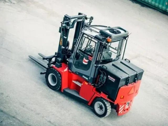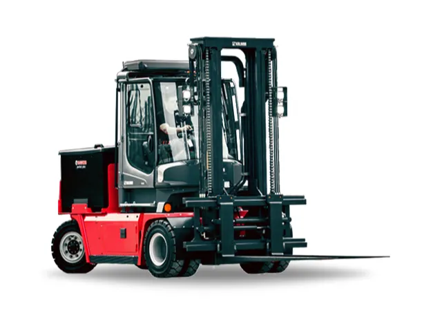 Montacargas eléctrico Kalmar ECG50-90L, uno de los equipos con mayor eficiencia operativa en tareas de movimiento de mercancía en almacenes al exterior y centros logísticos. Tiene una capacidad de carga de hasta 9,000 kg, con un motor eléctrico que le permite ahorros energéticos de hasta el 75 %.