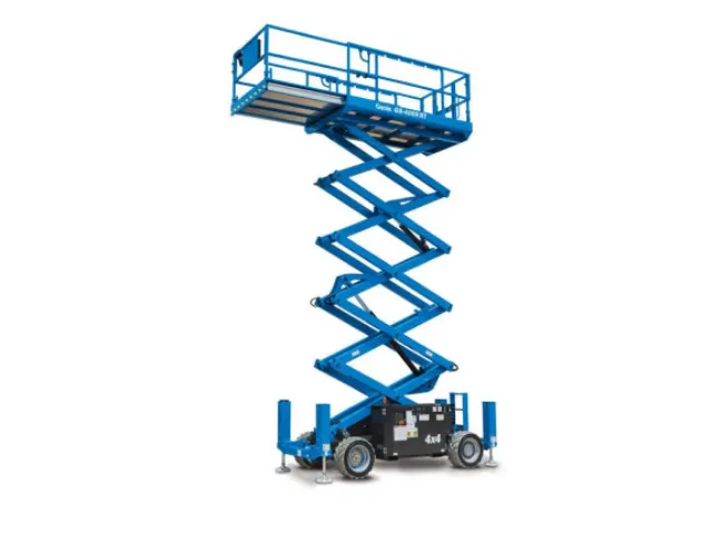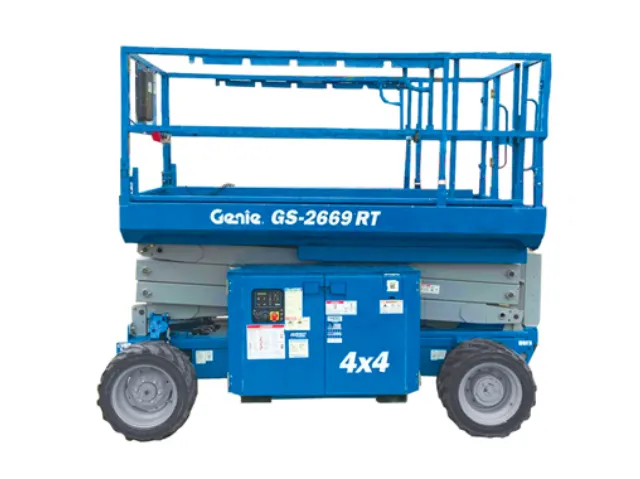 La Genie GS-2669 RT ofrece una altura máxima de trabajo de 9.7 metros con capacidad de carga de 680 kg, diseñada para trabajos en altura sobre terrenos desafiantes.