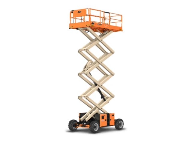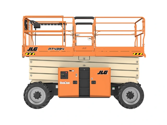 La JLG 4394RT ofrece una altura de trabajo de 15 metros y una capacidad de carga de 1,020 kg, adecuada para trabajos que requieren mayor alcance y superficie de plataforma. Su sistema de tracción en las cuatro ruedas, junto con los estabilizadores automáticos, garantiza operación segura en terrenos desafiantes.