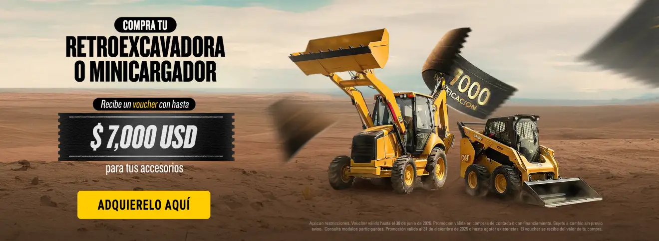 Potencia tu operación con maquinaria diseñada para entregar rendimiento constante en obra. Al adquirir una retroexcavadora o minicargador CAT, recibirás un voucher del 7% para adquirir los accesorios que optimizan la productividad de tu equipo.