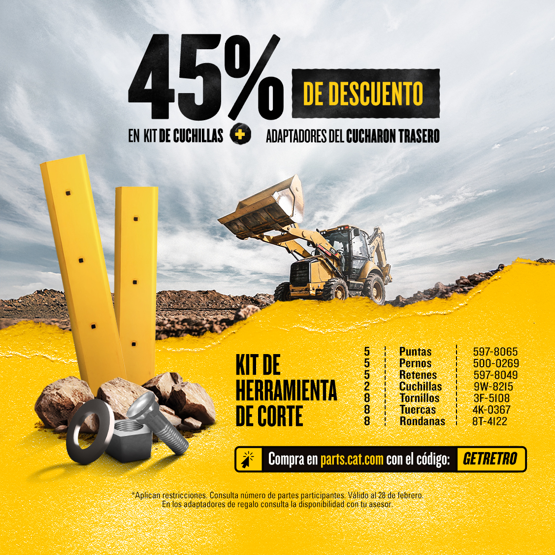 Obtén 45% de descuento en nuestro Kit de Cuchillas completo que incluye los adaptadores del cucharón trasero. Todo lo que necesitas en un solo paquete para maximizar el rendimiento de tu equipo. Calidad garantizada, instalación sencilla y el ahorro más grande del año.