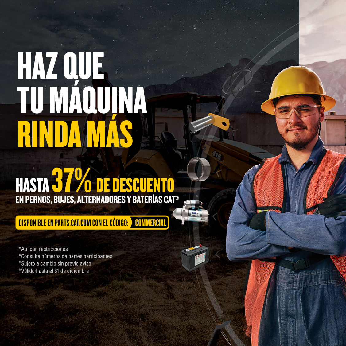 Tu maquinaria merece lo mejor para seguir rindiendo al máximo. Aprovecha hasta 37% de descuento en pernos, bujes, alternadores y baterías Cat®, con la facilidad de compra en línea en parts.cat.com.
